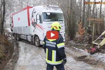 Die Freiwillige Feuerwehr Idolsberg wurde zu einer Lkw-Bergung alarmiert. Lkw kommt auf spiegelglatter Straße ins Rutschen – Bergung mit einem Bagger — Feuerwehr.media