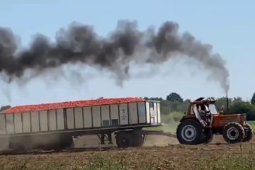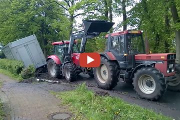 Ein in den Graben gerutschter LKW mit Anhänger wird mit Hilfe von Trekkern wieder „befreit“.