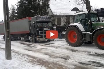 FENDT 820 versucht, einen Scania-LKW auf eisiger Straße zu schleppen