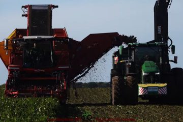 Rübenernte mit einem Grimme Maxtron 620, für die Bunkerleerung ist ein John Deere 8R 340 auf Zwillingen mit Hawe UW 2500 auf Raupen. Landtechnik MV – Agricultural Videos