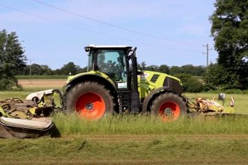 Gras schneiden bei Brünen, Kreis Wesel, NRW, Deutschland im August 2024. — Claas Axion 870 mit Claas Disco 9200c.– Claas Axion 870 mit Claas Disco 9200c.