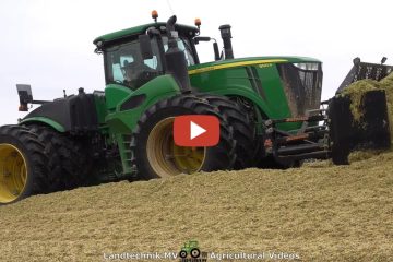 Maissilage mit einem Claas Jaguar 960, als Abfahrer John Deere und Fendt Traktoren. Auf dem Silo sind zwei John Deere, einer davon ein 9520R auf Zwillingen bei der Arbeit — Landtechnik MV – Agricultural Videos
