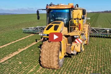 Hier ist ein Claas Axion 850 mit einem Rauch AGT Dügerstreuer mit 36 Meter Gestänge zu sehen. — Landtechnik MV