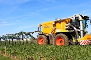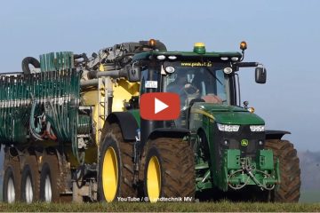 Agrarforst — Mission Gülle 2024 – John Deere 6155R ist dabei im Hundegang unterwegs. Möglich ist dies durch die lenkbare Achse des Zunhammer Güllefasses. Fünf Zubring-Gespanne liefern das Substrat zum Einsatzort.
