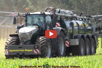 2022 Agrarservice Rügen mit einem Fendt 1046 und Samson PG II 31 mit Samson 36 Meter Schleppschlauchverteiler beim Ausbringen von Gülle in den Maisbestand. Transport mit zwei Fendt 826 Traktoren..