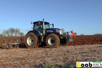 New Holland T7.200 Blue Power mit Lemken Juwel 7 5-Schar Pflug in den Morgenstunden am pflügen. — Roman Schmitz