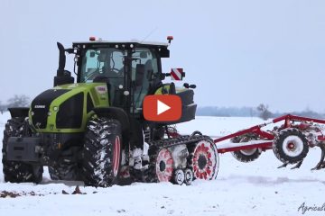 Neuer Raupentraktor Claas Axion 960 Terra Trac arbeitet mit Horsch Terrano im Schnee