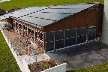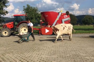 Landwirt Andreas Driller bringt ein neugeborenes Kalb auf einer Schubkarre in den Stall und die Mutter folgt
