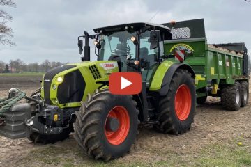 Hier ist ein Claas Axion 850 mit einem Rauch AGT Dügerstreuer mit 36 Meter Gestänge zu sehen. — Landtechnik MV