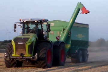 Claas Xerion mit Hawe Überladewagen in der Getreideernte 2015 in der Börde bei Hadmersleben. -Klaus Schroeder-