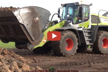 Ein John Deere 7710 fährt Erde mit einem Mammut Kipper. Beladen wird er von einem JCB 434S Agr