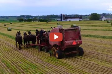 Erstaunlich! Amish Maultiere ziehen moderne Ballenpresse. Altmodisch trifft moderne Technik..