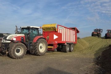 Lohnunternehmen Gottschalk mit einer Reihe von Case IH und Steyr Schleppern und Krone Häcksler und neuen Krone Ladewagen im Mais 2017–tractortube.com