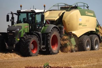 Ballen pressen mit einem Fendt 942 und Krone 1290 HDP II XC Presse. Ein New Holland W170D Radlader sammelt und verlädt die Quaderballen auf LKW und Traktoren. Am Ende ist noch ein Claas Axion 950 mit einer Claas Quadrant 5300FC zu sehen. Landtechnik MV – Agricultural Videos