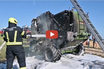 Die Feuerwehren Allerheiligen und Perg mussten am Mittwochnachmittag zu einer brennenden Krone Ballenpresse ausrücken. Der Landwirt brachte diese sofort aus dem Feld und stellte sie in der angrenzenden Wiese ab.- TEAMFOTOKERSCHI