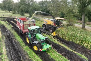 Mike van den Hardenberg – Schlammig – LU. Timmerman aus Staphorst, der unter schlammigen Bedingungen Mais häckselt. Der Mais wird von einem New Holland FR550 gehäckselt, mit 2x John Deere 6215R mit Dezeure-Silierwagen.
