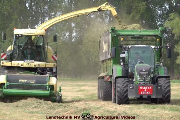 Lu. Marten & Teune im ersten Schnitt mit zwei John Deere Traktoren und Krone Mähwerken, einem Fendt mit Krone Swadro 2000, einem Krone BigX 630 und verschiedenen Fendt Traktoren mit Krone Tridemanhängern für den Transport. Landtechnik MV – Agricultural Videos