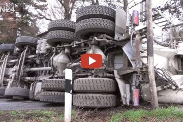 2020 – VN24 – Betonmischer nach Unfall auf Seite gestürzt – schwierige Bergung in Datteln – Es wurden 2 Kräne benötigt