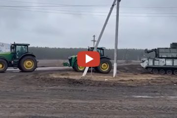 Landwirten schleppen russische Tor-M2 -Flugabwehr mit 2x John Deere Traktoren ab