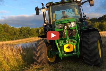 Frauenpower am Abend mit einem John Deere 6110R – Heuernte 2022 in der Abenddämmerung. Frauenpower wird hier groß geschrieben und so wird der Hirsch durch die verwinkelte Wiese mit dem Heckmähwerk gesteuert. — Roman Schmitz