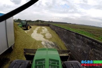 BGA Kloosterman John Deere 7280R + 7730 schieben mais. Mehrere DAF LKWs mit Schubbodenauflieger transportieren mais.