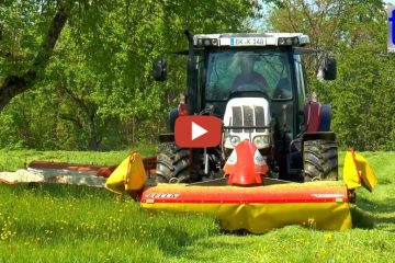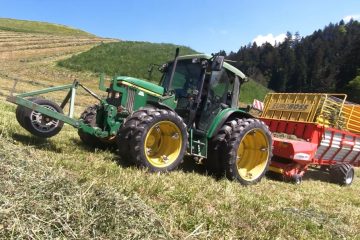 Berner Landtechnik — Einsatz in den steilen Hängen im Emmental. Dabei arbeitet das Gespann Pöttinger Euroboss 290T Supermatic und John Deere 6210 zur vollsten Zufriedenheit.
