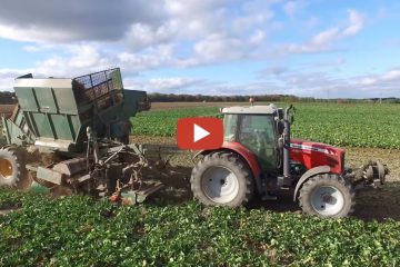AgrarBlick — Uelzen (Niedersachsen) Rüben roden 2018 – Rübenroder Thyregod T7 aus Dänemark gezogen vom Schlepper Massey Ferguson 6460