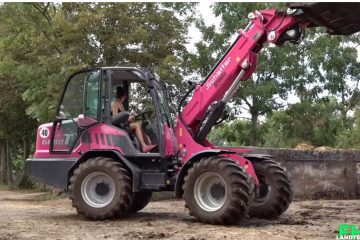 Landtechnik FHD Girlpower – Mist streuen bei einem Pferdehof mit einem New Holand T7.190 und Strautmann VS 2005 Miststreuer. Verladen wurde der Mist mit einem pinken Hoflader der Marke Schäffer.