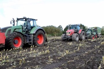 LU. Markus Holtgers bei der Maissilage 2023 mit einem Claas Jaguar 960 und zwei Claas und einem Fendt Traktor als Abfahrer. Am Feldrand wird mit einer Ropa/Nawaro Bunkermaus, System Palandt, auf LKW verladen. Auf dem Silo sind ein Claas Axion 960 TT und ein John Deere bei der Arbeit. — Landtechnik MV – Agricultural Videos
