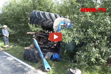 Traktor-Baukran-Gespann schaukelt sich auf und kippt in den Straßengrabe — NWM-TV Nord-West-Media TV