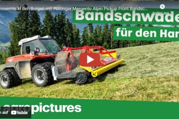agropictures – Heuernte in den Bergen mit Pöttinger Mergento Alpin Pickup Front Bandschwader an Metrac und Lintrac- Pickup Schwader mit Förderband liegen voll im Trend. Sie behandeln das Futter besonders schonend und lassen Steine und Schmutz am Boden zurück