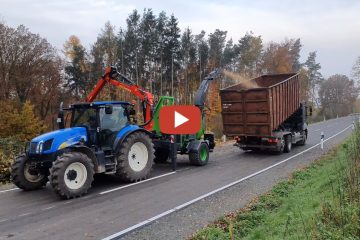 Landwirtschaft im Odenwald — Hackschnitzel häckseln 2019 mit New Holland T 6030 und Heizohack HM 8-500 KFL Transport mit LKW.