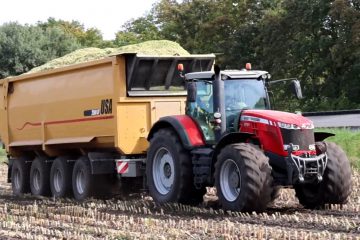 Claas Jaguar 990 mit 5 Massey Ferguson USA Abschiebewagen. Landmaschinen und Fahrzeuge!