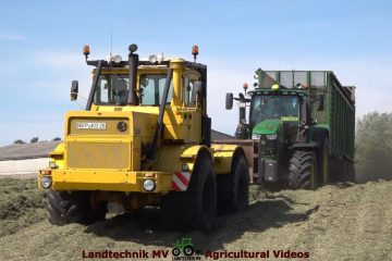 Gut Darß im ersten Schnitt mit einem Fendt Katana 650 und Kemper Pick Up, zwei John Deere Traktoren mit Hawe Anhängern sind für den Transport im Einsatz. Auf dem Silo sind ein John Deere und zwei Krirovets K700 bei der Arbeit. Landtechnik MV – Agricultural Videos