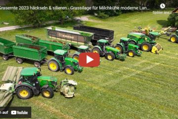 AgrarBlick — Grasernte 1. Schnitt – Großeinsatz im Juni 2023 bei der Landgenossenschaft Pröttlin eG im Landkreis Prignitz, Brandenburg. John Deere 8600i Feldhäcksler und John Deere Traktoren….