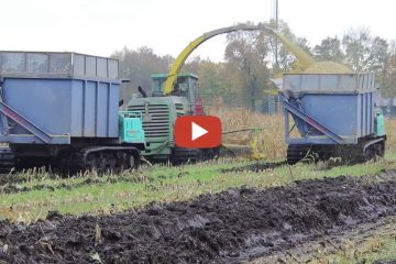 Lohnunternehmer Oussoren bei der Maisernte mit Raupenfahrzeugen in Niederlande in Zusammenarbeit mit Lohnunternehmer Blankespoor. Durcheinander auf einem eher sumpfigen Feld. November 2021 — Gerbrand Mulder