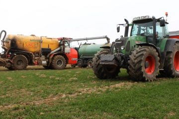 Massey Ferguson 399, 7499, 8460, 7624 und ein MAN LKW. Zahlreiche Fässer und die Verschlauchungstechnik war von VEENHUIS. — Die Agrarfilmer