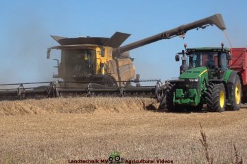 Landtechnik MV – Agricultural Videos – Getreideernte mit zwei New Holland CR 10.90, jeweils mit MacDon FD 241 Flexdraper Schneidwerk. Für den Transport sind verschiedene John Deere Traktoren mit Anhängern von Annaburger im Einsatz.