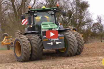 Agrar Paparazzi — Hier ist ein John Deere 8370R mit einer Claydon Hybrid 6m beim Ackerbohnen Drillen 2021.