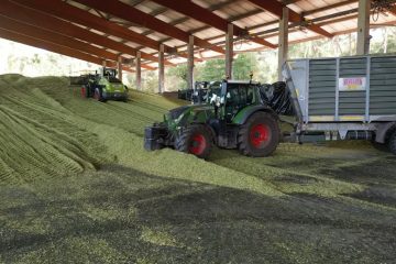 EmsAgriFilm — Maisernte 2024 mit überdachtem Silo einer Biogasanlage. Es fahren 2 Häcksler (JohnDeere9700i & Claas Jaguar 970). Zudem fahren mehrere Abfahegespanne von JohnDeere und Fendt.