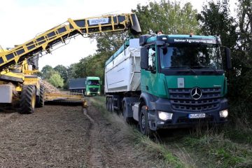Ropa Maus 6 , MAN-, Mercedes-, Scania LKW. – Zuckerrüben Ernte in Bedburg – Hau, NRW, Deutschland im September 2025. Landmaschinen und Fahrzeuge!