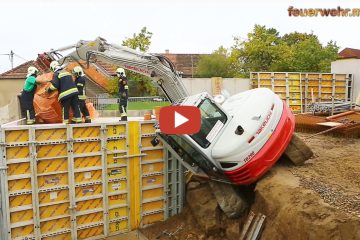 Auf einer Baustelle in der Nähe des Feuerwehrhauses kam ein 9 to Bagger zu nahe an den Rand einer Baugrube und drohte in diese zu stürzen. Feuerwehr.media