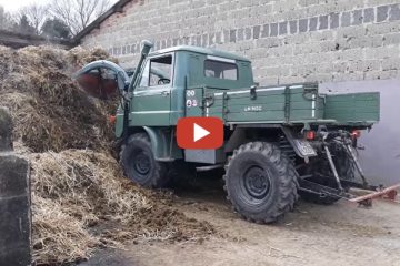 Unimog 411 beim Mistschieben – Mist von zwei Pferden und zwei Eseln zusammenschieben mit Unimog 411 und Schmidt FL2 — rayklus