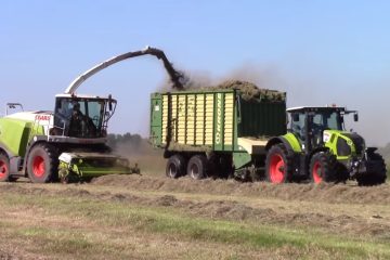 CANADIAN FARMER – Eine komplette Ausrüstung steht bereit, um die Luzerne an einem einzigen Tag zu ernten. Claas Lexion 950 Jaguar Feldhäcksler, 3 New Holland Traktoren, 2 T7 und ein großer T9, Oxbow 334 Forage Merger, 2 Big Dog Ladewagen sowie ein Veenhuis-Wagen.