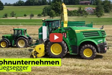 1. Schnitt Grashäcksel mit John Deere im grossen Stiel. Gras Häckseln mit John Deere 8600i und John Deere Traktoren. – Patrick05