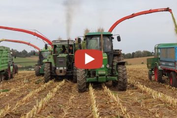 Maisballenpressen am Wagyuhof 2023 – Der Mais wurde gehäckselt und in Rundballen gepresst. Hier war vom Unternehmen Wildfutter Breitenberger der Krone Big X 580 und ein Fendt 720 mit einer Göweil LT-Master im Einsatz. — Landwirtschaft in Niederösterreich