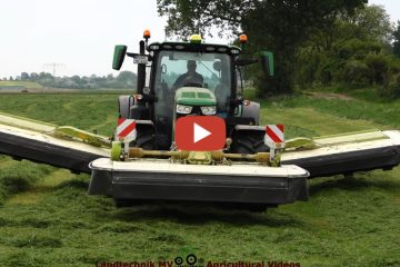 LU. Marten & Teune im ersten Schnitt mit zwei John Deere, 6R 215 und 6250R jeweils mit Claas Mähwerken, einem John Deere 6R 215 mit Krone Swadro 2000 und einem John Deere 9800i Häcksler, mit verschiedenen John Deere 6R und Krone TX Anhängern für den Transport. Landtechnik MV – Agricultural Videos