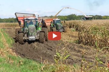 Mike van den Hardenberg – Maisernte im Schlamm 2023 –Mit einem Claas Jaguar 900. Claas-, Fendt-, New Holland- und John Deere-Traktoren .