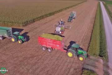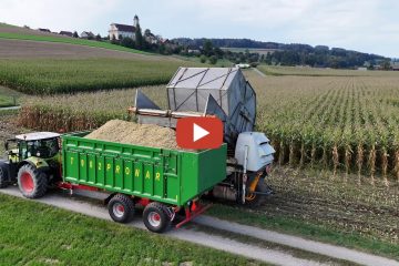 Girlpower……. feruontour – 2023 Maisernte – Bucher Ernte Technik AG mit seinem Raupenbunkerhäcksler und Pressbetrieb Andreas Schwegler mit seiner variablen Maisquaderballenpresse.