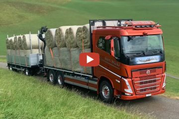 Geri Wicki 2022 Heu Rundballentransport im Berggebiet mit VOLVO FH 540 und Steffen Anhänger mit Tridec Manöverierlenkung. Ablad mit Stepa Heukran.